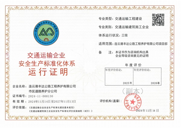 近日,豐達(dá)公司市區(qū)道路養(yǎng)護(hù)分公司順利通過(guò)江蘇省交通運(yùn)輸協(xié)會(huì)認(rèn)定,被評(píng)為交通運(yùn)輸企業(yè)安全生產(chǎn)標(biāo)準(zhǔn)化建設(shè)三級(jí)企業(yè)。