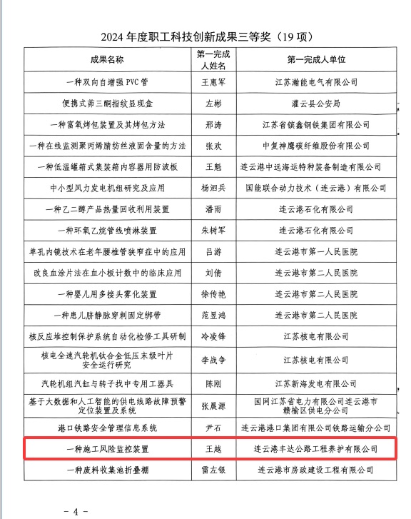 為全面落實(shí)習(xí)近平總書記關(guān)于科技創(chuàng)新的重要指示要求,連云港市總工會(huì)緊扣《新時(shí)代連云港產(chǎn)業(yè)工人隊(duì)伍建設(shè)改革實(shí)施方案》,在全市職工中征集科技創(chuàng)新成果和先進(jìn)操作法。經(jīng)個(gè)人申報(bào)、單位推薦、專家評(píng)審、媒體公示,認(rèn)定和表彰33項(xiàng)操作法為“2024年度連云港市職工科技創(chuàng)新成果”。公司職工王越的“一種施工風(fēng)險(xiǎn)監(jiān)控裝置”獲市職工科技創(chuàng)新成果三等獎(jiǎng)。