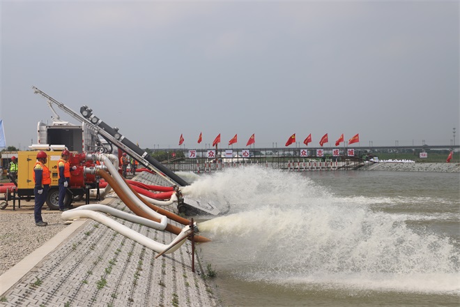 此次全市防汛搶險(xiǎn)綜合演練設(shè)置臺風(fēng)、城市特大暴雨、堤防險(xiǎn)情、人員落水四個(gè)搶險(xiǎn)救援背景并按照預(yù)警響應(yīng)、隊(duì)伍集結(jié)、險(xiǎn)情處置等環(huán)節(jié)有序開展,豐達(dá)公司主要演練科目為“城市特大暴雨——城市內(nèi)澇處置”,利用垂直供排水搶險(xiǎn)車、及字母式大流量排水車進(jìn)行機(jī)泵排澇。
