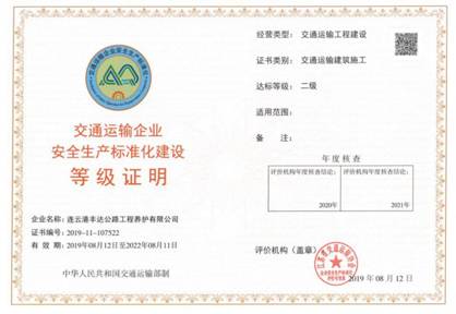今年以來,豐達(dá)公司積極開展安全生產(chǎn)標(biāo)準(zhǔn)化達(dá)標(biāo)創(chuàng)建工作,將安全生產(chǎn)標(biāo)準(zhǔn)化工作納入公司常態(tài)化管理,對(duì)照《交通運(yùn)輸企業(yè)安全標(biāo)準(zhǔn)化》考核細(xì)則,先后修訂完善了安全管理制度7個(gè),安全職責(zé)6個(gè),各種規(guī)程3個(gè),公司安全基礎(chǔ)設(shè)施建設(shè)和基礎(chǔ)管理逐步加強(qiáng),生產(chǎn)作業(yè)現(xiàn)場(chǎng)管理日趨規(guī)范,安全生產(chǎn)管理水平穩(wěn)步提升?,F(xiàn)已被江蘇省交通運(yùn)輸協(xié)會(huì)認(rèn)定為交通運(yùn)輸企業(yè)安全生產(chǎn)標(biāo)準(zhǔn)化建設(shè)二級(jí)企業(yè)。