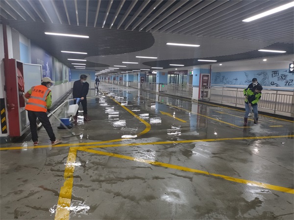 ? ? ? 為全面提升綜合客運樞紐停車場“五一”節(jié)前現(xiàn)場環(huán)境衛(wèi)生,為廣大旅客提供干凈整潔的出行環(huán)境。4月29日晚,在連云港站******一列火車運營下客結束后,豐達物業(yè)管理公司組織了10名員工,對客運樞紐地下停車場出租車道、社會車道等主要通道的地面痰跡、污跡、頑跡等進行了全面清理,清理面積近3500平米。