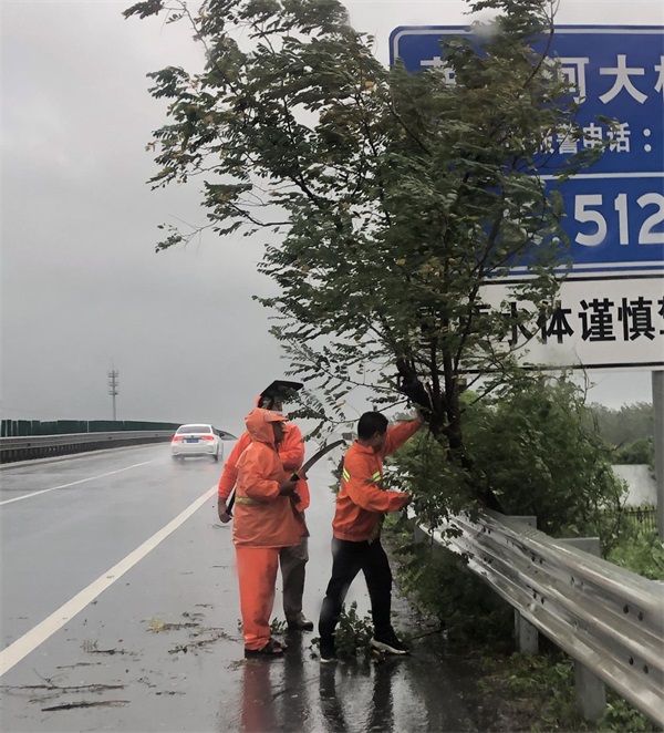 由于“煙花”臺風(fēng)影響,公司管養(yǎng)道路發(fā)生多處路樹倒伏,橙色突擊隊(duì)?wèi)?yīng)急搶修人員發(fā)揮連續(xù)作戰(zhàn)精神,無懼風(fēng)雨,連夜趕赴現(xiàn)場,迅速清理倒伏樹木,確保路面暢通。對于地勢低洼路段積水嚴(yán)重情況,養(yǎng)護(hù)應(yīng)急人員火速將抽水泵運(yùn)到現(xiàn)場,開足馬力抽水排水,同時及時疏通排水溝、涵洞,搶抓時間及時修補(bǔ)路面坑塘,第一時間消除道路安全隱患,確保公司管養(yǎng)道路安全暢通。