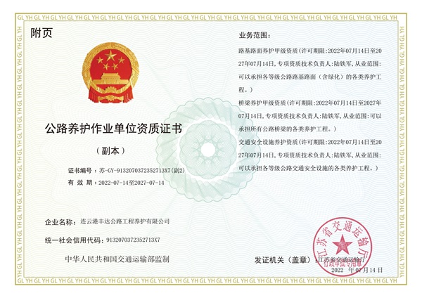 7月14日,豐達(dá)公司此次申報(bào)的公路養(yǎng)護(hù)作業(yè)單位資質(zhì)“路基路面甲級、橋梁甲級、交通安全設(shè)施”三個專業(yè)順利通過江蘇省交通運(yùn)輸廳核準(zhǔn),申報(bào)成功。