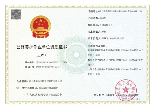 本次新取得的三項(xiàng)資質(zhì)證書,為豐達(dá)公司繼續(xù)立足公路養(yǎng)護(hù)市場奠定基礎(chǔ),也意味著可以拓展更加廣闊的公路養(yǎng)護(hù)市場領(lǐng)域。