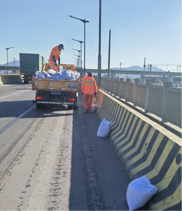 公司進(jìn)一步完善了除雪防滑保暢預(yù)案,結(jié)合實(shí)際開展了除雪防滑應(yīng)急演練。對除雪機(jī)械設(shè)備進(jìn)行了全面系統(tǒng)的保養(yǎng)和維護(hù),儲備了融雪劑700余噸、防滑混合料300余噸,并在沿線橋梁、匝道、急轉(zhuǎn)彎等易滑易結(jié)冰路段放置了防滑砂和石子等混合料。同時,安排專人時刻關(guān)注氣象變化,及時掌握氣象信息,一旦出現(xiàn)降雪天氣,隨時出動人員和設(shè)備清障除雪。