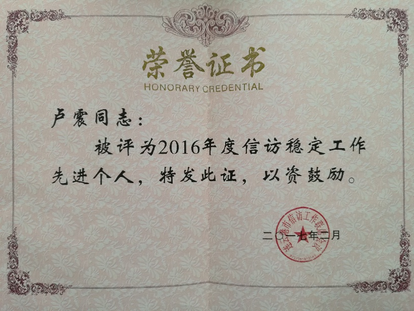 盧震同志平時(shí)認(rèn)真履行工作職責(zé),扎實(shí)有效地做好信訪穩(wěn)定工作,為促進(jìn)企業(yè)和諧穩(wěn)定發(fā)展作出了貢獻(xiàn)。