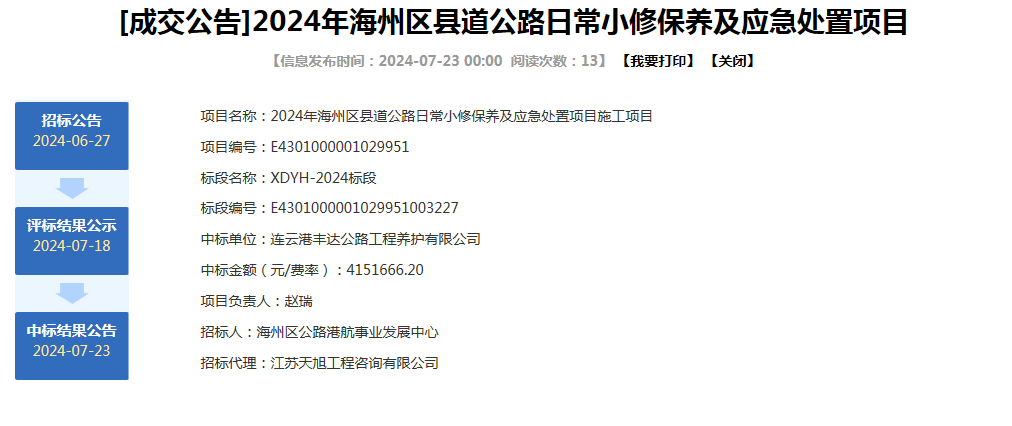 近日,豐達(dá)公司成功中標(biāo)2024年海州區(qū)縣道公路日常小修保養(yǎng)及應(yīng)急處置項(xiàng)目,中標(biāo)金額415萬元,工期12個月。
