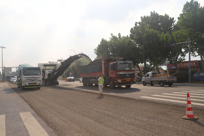 人民路外圍車流量大,重型車輛較多,路面沉降、龜裂、車轍等病害較為嚴(yán)重,行車舒適性較差,且不能全封閉施工。為加快施工進度,避免高峰路段擁堵,項目部人員不畏高溫酷暑,攻堅克難,采取降塵除塵、分段施工、基坑防護等多項措施錯峰施工,克服噪音擾民等諸多困難,做好全線文明施工工作,共投入機械設(shè)備18余臺次,人員30余人,歷經(jīng)八晝夜的加緊施工,共修補攤鋪路面56336.7平方米。